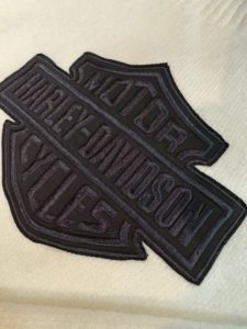 光沢のあるサテンステッチでフェイクレザーのアップリケを美しく縫い上げ、